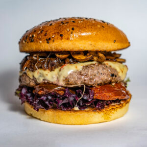 یک عدد برگر دست ساز گوشت گوساله گریل شده ۱۰۰% ، سیب زمینی سرخ شده، گوجه، کاهو، خیارشور، سس قارچ، سس تک نفره، نان گرد