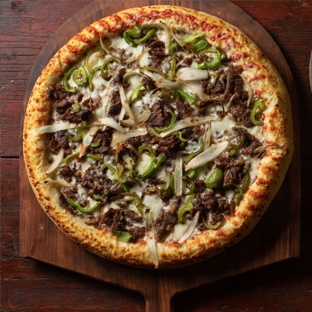 خمیر پیتزا آمریکایی، فیله گوساله طعم دار شده، پنیر موزارلا، قارچ، فلفل دلمه ای، زیتون سیاه اسلایس شده، ریحان تازه، سس مارینارا، به همراه سس تک نفره