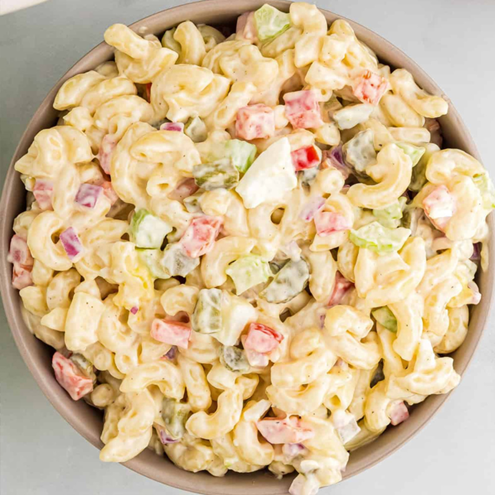 500 گرم، ماکارونی پخته شده طرح دار، خیار شور، هویج، ژامبون گوشت 70%، ذرت، سس مایونز