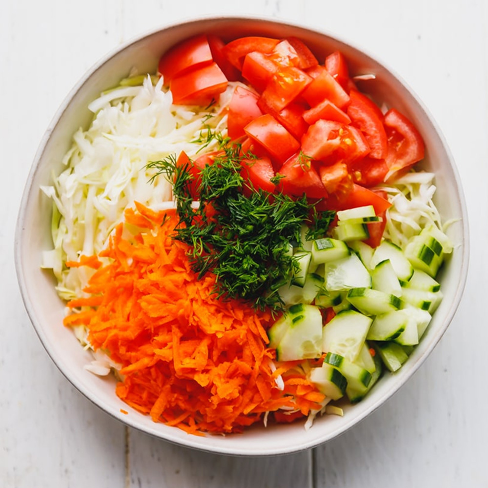 کاهو، خیار، گوجه، هویج رنده شده، ذرت، سس مخصوص